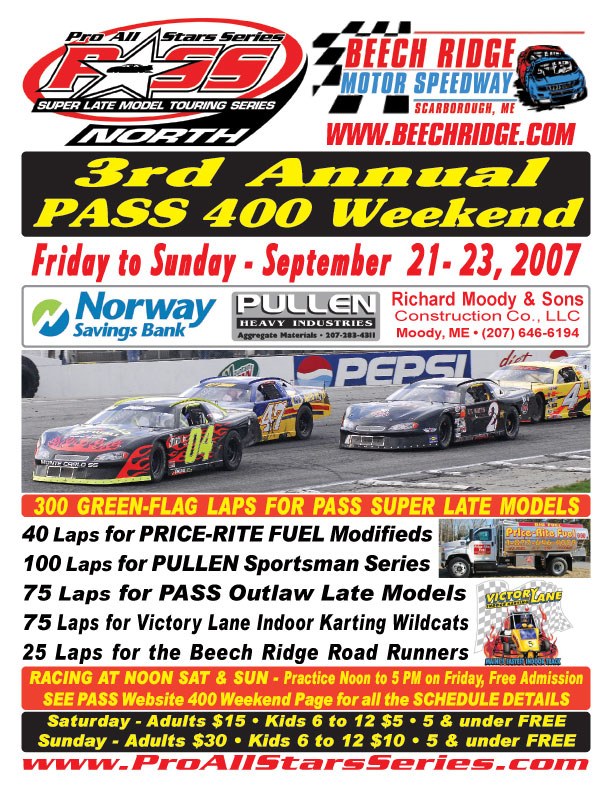 Weekend (Naples, ME ' September 16, 2007) Now in only its third year, the PASS 400 Weekend brought to you by Richard Moody & Sons Construction, Norway Savings Bank, and Pullen Heavy Industries at Beech Ridge Motor Speedway, Scarborough, ME is rapidly becoming the biggest race event in Northern New England. There will be over 300 race teams competing over the four days from Thursday night September 20th to the big $10,000 to win DJ Equipment PASS North Super Late Model 300 green-flag lap race on Sunday afternoon, but, more importantly, it's the names of the racers who choose to race PASS that make this the biggest show. It's a Who's Who of local racing. In the PASS North Super Late Model 300 qualifying heats on Saturday the 22nd and in the 300 lapper on Sunday afternoon the 23rd, race fans will see Ben Rowe, Johnny Clark, Mike Rowe, Richie Dearborn, Travis Benjamin, Kelly Moore, Brad Leighton, Dave Dion, Cassius Clark, Alan Wilson, Rick Martin, Gary Smith, and a host of Beech Ridge favorites like Bub Bilodeau, Dan McKeage, Alan Tardif, Curtis Gerry, Billy Rodgers, Donnie Whitten, Kevin Kimball, Mike Fowler, among others. And how about the under 20 crowd, Trevor Sanborn, Derek Ramstrom, and Adam Bates are currently fifth, seventh, and eighth in the PASS North points chase. And don't forget Joey Porciello, Jeremie Whorff, and Stephen Berry as part of the young guns chasing the frontrunners in the big fast Super Late Models. The PASS Outlaw Late Models are full of names you know ' Last year's winner Dennis Spencer will be back to defend his title, 2006 Central Division Champion Jimmy Rosenfield, 2006 North Division Champion Matt Lee, Alan Wilson, Walt Hammond, Jay Sands, Mike Harnish, Brian Whitney, Mike Thomas, Tony Ricci in the Mulkern car, Busch North fan favorite Carey Heath, Charlie and Chuck Colby, Donnie Lashua, Mike Fowler, and many more will be there. And it will be another barnburner as they go at it for 75 green-flag laps in the Norway Savings Bank 75 for $2,000 to win or $1,000 and transfer to the PASS 300 that pays $1000 to start. Either way, the winner takes home $2,000 . . . but has a chance for more if he or she transfers. Several drivers are going to do double duty in both the Outlaws and the Super Late Models ' Mike Fowler, Jay Sands, Alan Wilson and several others have indicated their plans for the big weekend include both races. The PASS Modified Division will be going at it for 40 green-flag laps in the Price-Rite Fuels 40 on Sunday afternoon. Chris Staples of Brunswick, ME holds a 49 point lead over Troy Morse of Bridgton, ME with Mark Lucas of Harpswell, ME only five markers behind Morse as the season moves into the homestretch. Chris Smith of Scarborough has been Mr. Steady with four thirds in nine races and has a solid hold on fourth in the points. However, the big winners in 2007 have been Gary Norris, Jr of W. Gardner, ME and Jason Taylor of Searsmont, ME with three wins each. With only three races left, it's far from over if Norris and Taylor keep up their winning ways, but Staples, Morse, and Lucas are no rookies with a host of wins up and down the state of Maine. Some of the best short track racing this year has been in the new PASS Pullen Sportsman Series featuring some of New England's best Limited, Sportsman, Street Stock, and Super Street racers. No matter what you call them at your local track, with over 50 cars already participating this season Dan McKeage, Jerry Harrison, Mike Landry, Robert Emery, Jr, Shane Tatro, and Kurt Hewins have put on some great races in the series premier year. And most recently, Gentleman George Baldwin from Lowell, MA bested them all at Canaan Fair Speedway, Canaan, NH on September 3rd. The Pullen Heavy Industries 100 on Sunday afternoon is sure to be exciting. Cole Watson of Naples, ME dominated last year's Wildcat 75 with Dan Wink of N. Berwick, Billy Childs, Jr of Leeds, and Brian Caswell of Buxton right behind. But this is a different year, and with more than fifty cars expected for the Victory Lane Indoor Karting 75, someone will surely surprise these top runners in the Saturday afternoon/evening show along with the T & K and Sons Concrete Roadrunner 25. And Saturday also features all the PASS Super Late Model, Outlaw Late Model, Modified, and Sportsman Series heats and consis. The weekend starts early on Thursday at 5:45pm with the N. E. Dodge Dealers Mid-Week Series with heats and then four fifty lap features for the Stock 4's, V8 305s, V8 350s, and the exciting Truck Series. Friday is practice day from noon to five with FREE grandstand admission for all fans who want to get a taste of what Saturday and Sunday will be like. |
