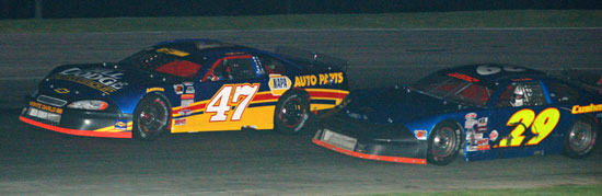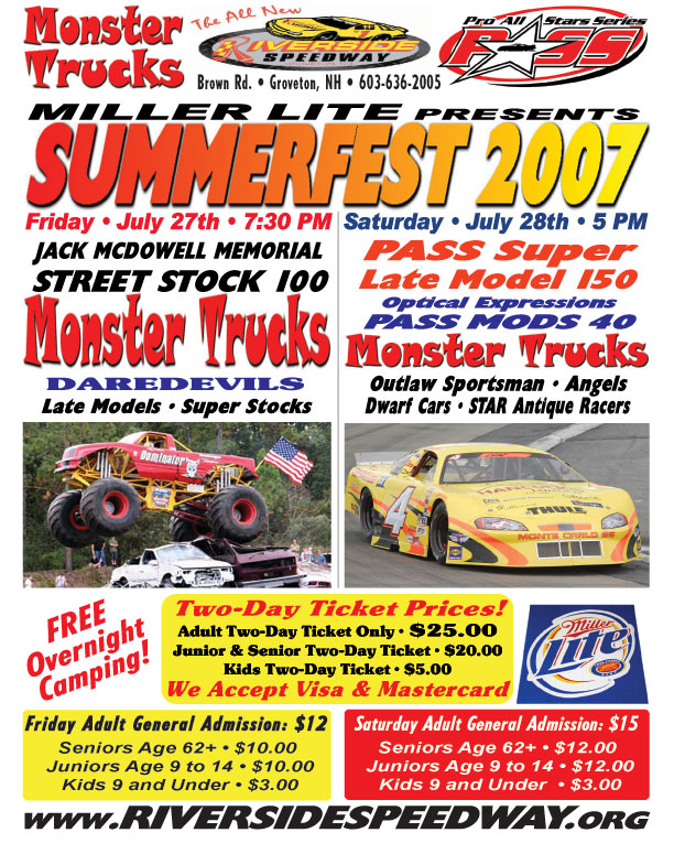 Speedway Super Late Models Finish 150-Lap Event in Tight Formation NAPLES, ME (July 29, 2007) – Experience beat out youth Saturday night at Riverside Speedway in Groveton, New Hampshire when the Pro All Stars Series (PASS) North Super Late Models came to town for their 150-lap Miller Lite Summerfest event. Kelly Moore, the 1995 NASCAR Busch North Series champion and the winningest driver in Busch North/Busch East Series history, stayed barely ahead of Trevor Sanborn, an up and coming Maine driver, at the finish line to take the victory. The race saw three different drivers set the pace in its various stages. Rookie Stephen Berry led early on, Sanborn dominated the middle stages of the event and then Moore took over after passing Sanborn on lap 103. Moore never pulled far away from Sanborn and as the laps clicked down, there was a large break-away pack of the top nine cars running nose-to-tail. At the line, the order of finish was Moore, Sanborn, Richie Dearborn, Johnny Clark and Ben Rowe. With his top five finish, Rowe unofficially maintains the PASS North point lead over his father Mike Rowe. The PASS North Super Late Models will return to action Saturday, August 11th in the Atlantic CAT 250 at Scotia Speedworld in Halifax, Nova Scotia. |