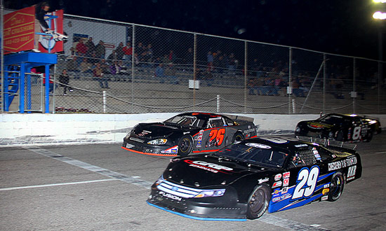| Austin Theriault #29 noses ahead of Preston Peltier #26 at the checkers. | |||||||||||||