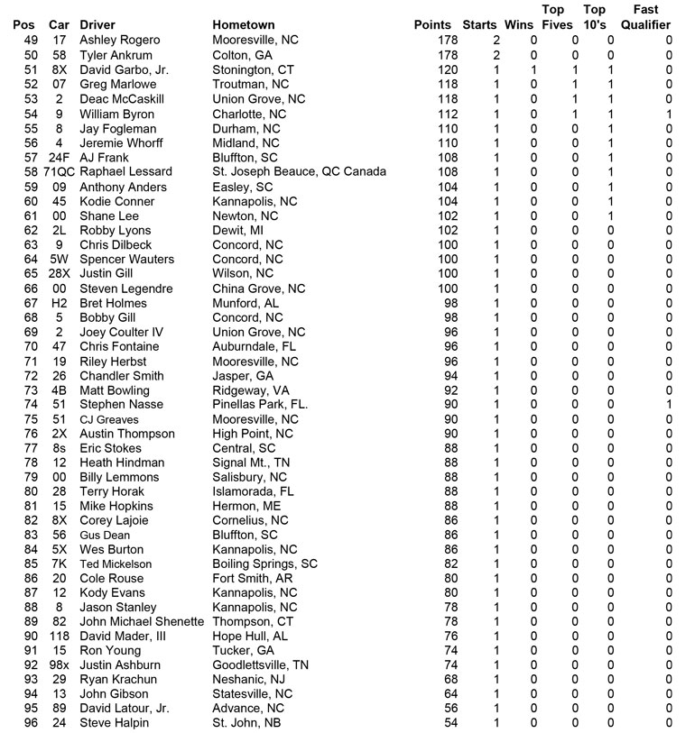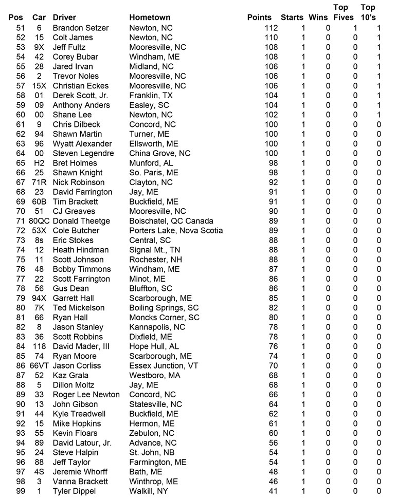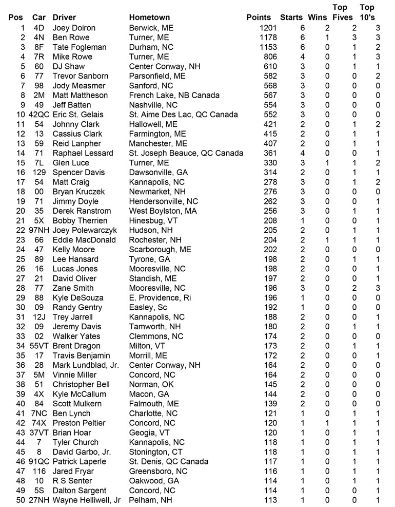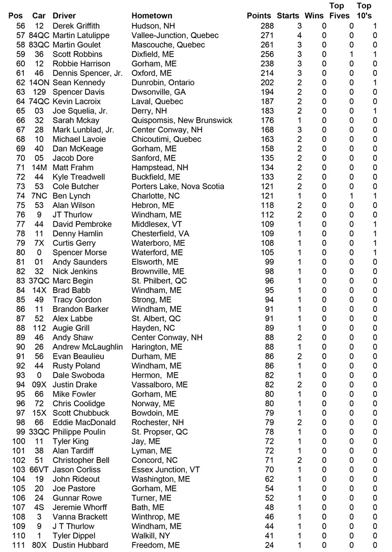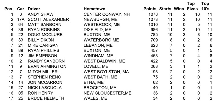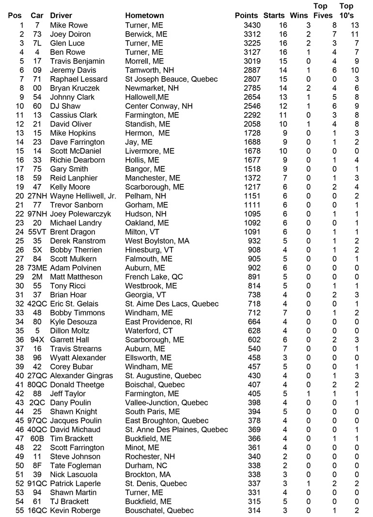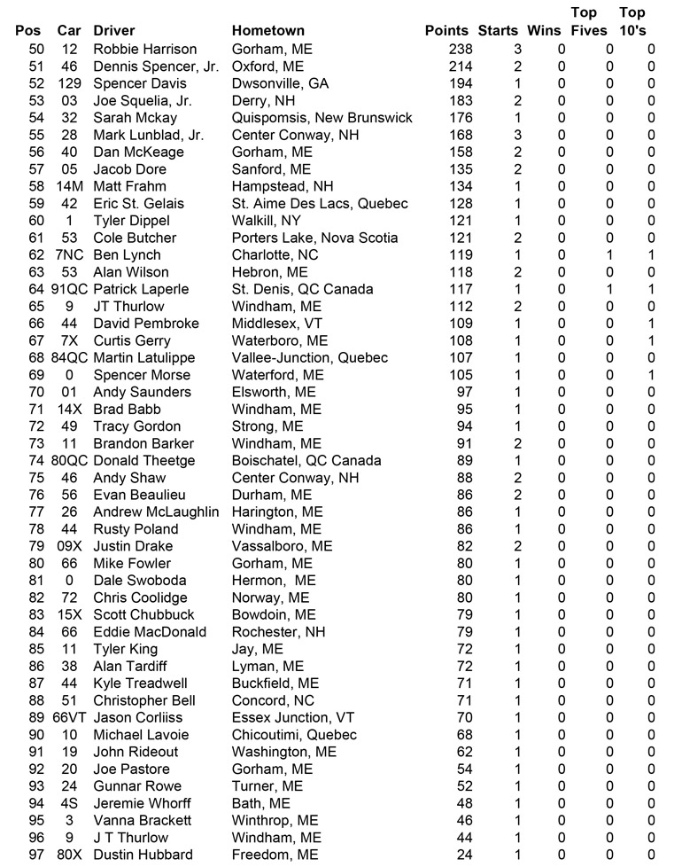 ![]() - Oct. 5th Final Points - 2015 PASS NORTH SLM POINTS STANDINGS NOTE: Those drivers who had run ALL North events have dropped their lowest points race and included the NHMS points in their totals. Eligible drivers were: M. Rowe, Doiron, Luce and B. Rowe PASS NORTH SLM 2015 POINTS FUND | 2014 | 2013 | 2012 | 2011 | 2010 | 2009 | 2008 | | 2007 | 2006 | 2005 | 2004 | 2003 | 2002 | 2001 | |